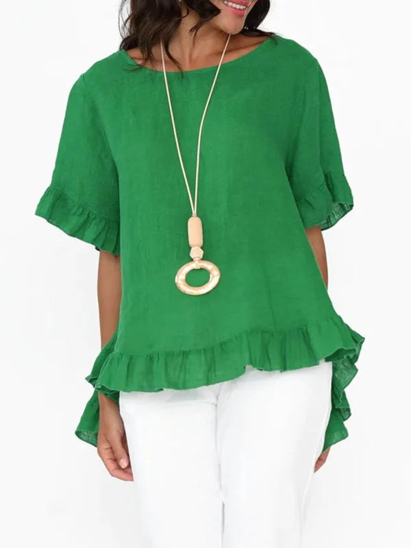 Ruffle Hem Short Sleeve Round Neck Button-Back Top